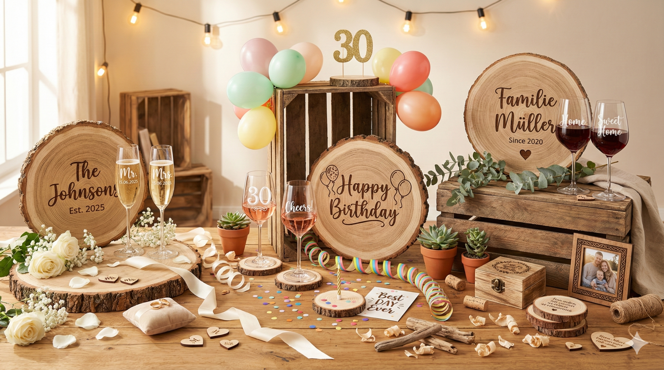 Natürliche Holzgravuren auf Schneidebretter, Frühstücksbrettchen und Baumscheiben. Perfekt für rustikale und warme Geschenkideen.